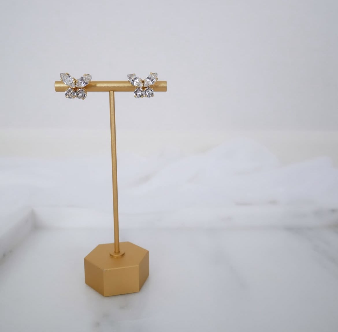 ゴールドの蝶々のチャームは、ピアスポストにつけたり外したりしてその日の気分によってデザインを変えて楽しんでいただけます。